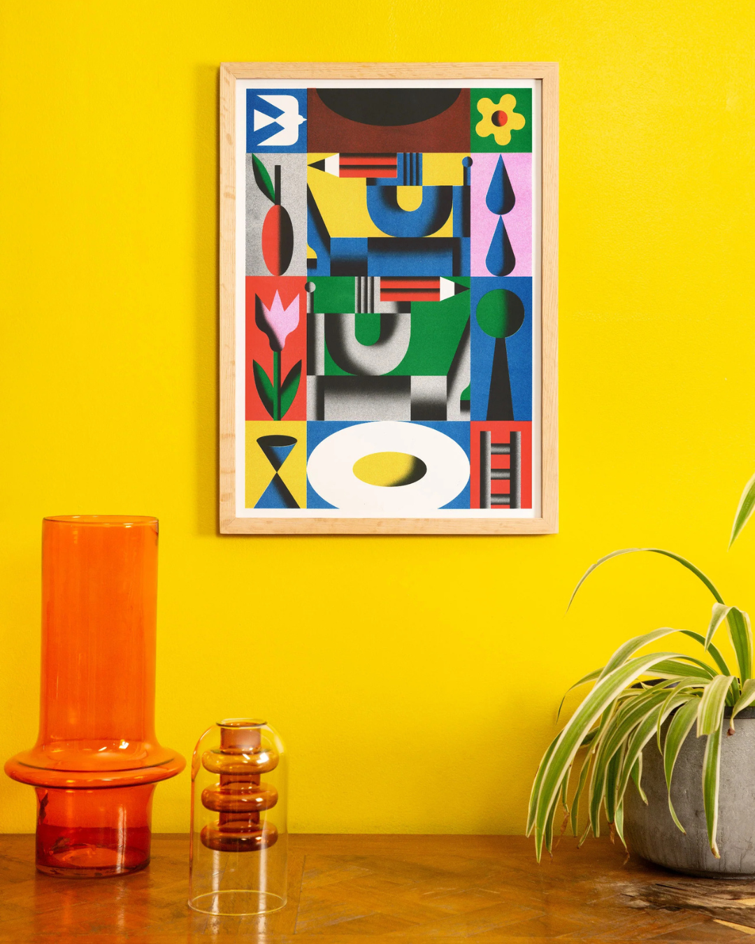 Unique Design ~ This risograph-printed artwork by KIBLIND Workshop showcases ZEBU’s signature punchy shapes and striking colors, inviting viewers to envision a dynamic new world.