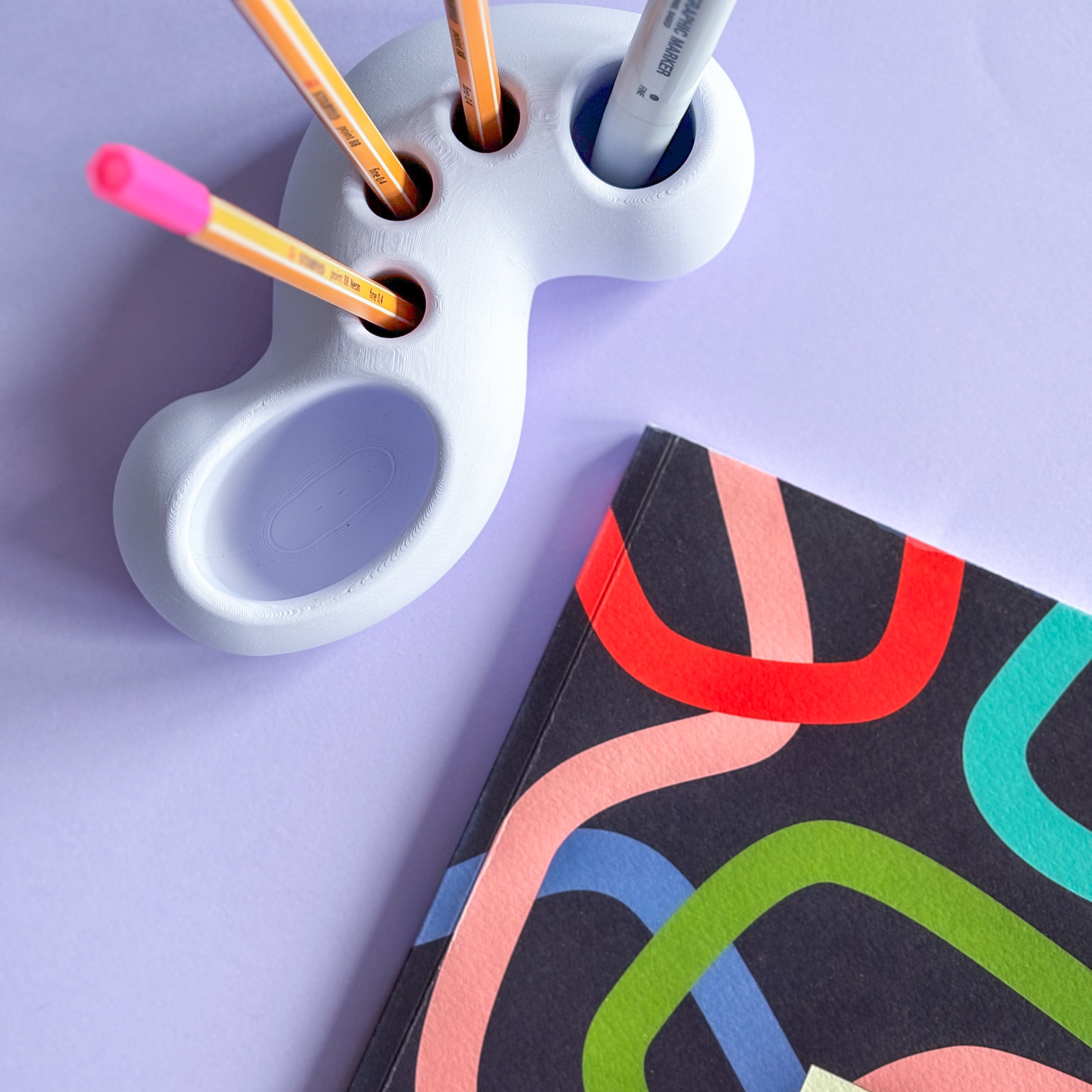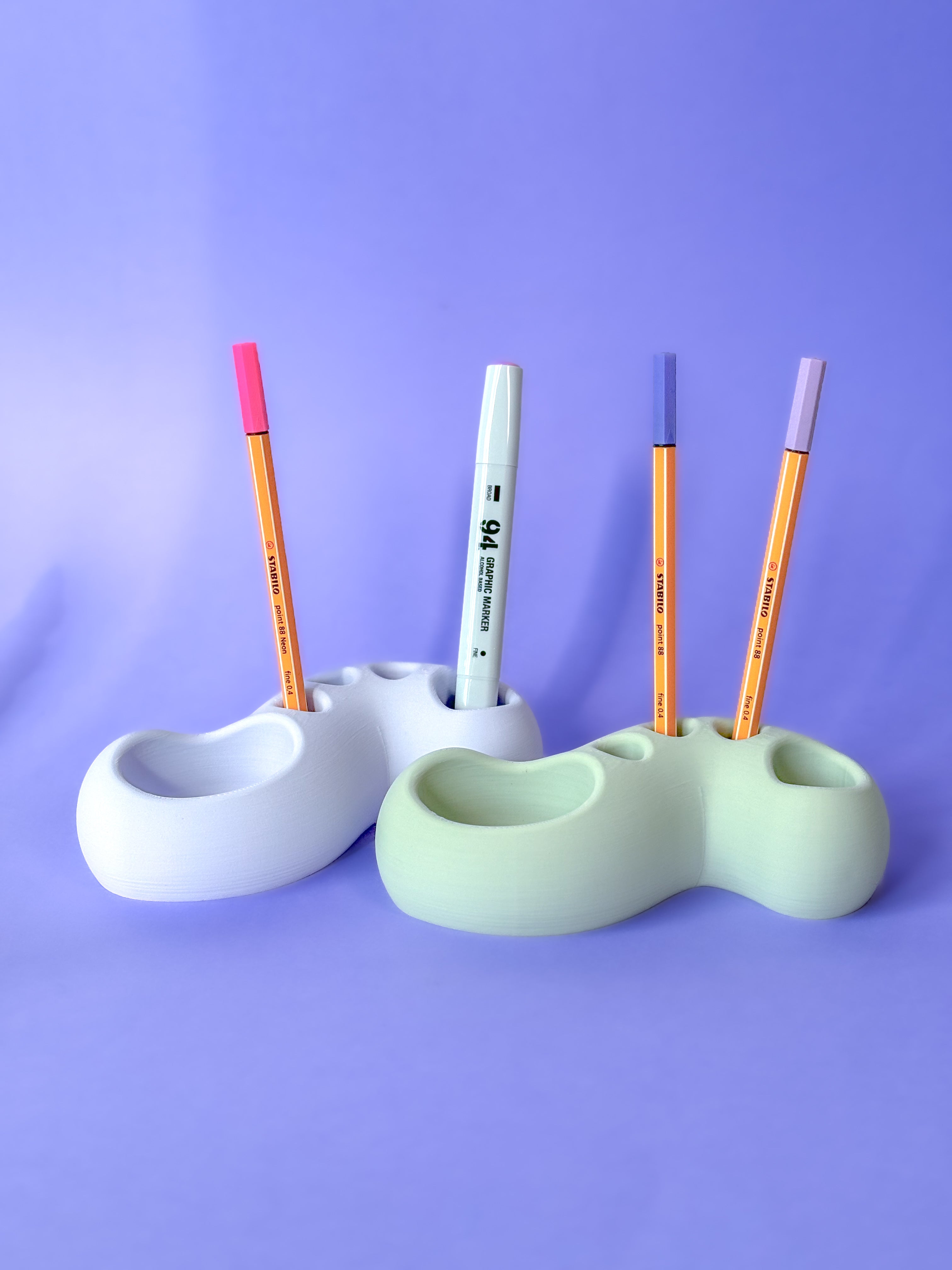 3D Printed ~ Created from hand-drawn sketches and transformed into 3D models, the Swirl Pencil Holder is crafted using eco-friendly PLA. Its smooth, curving shape offers lightness and stability, perfect for holding multiple writing tools without tipping over.