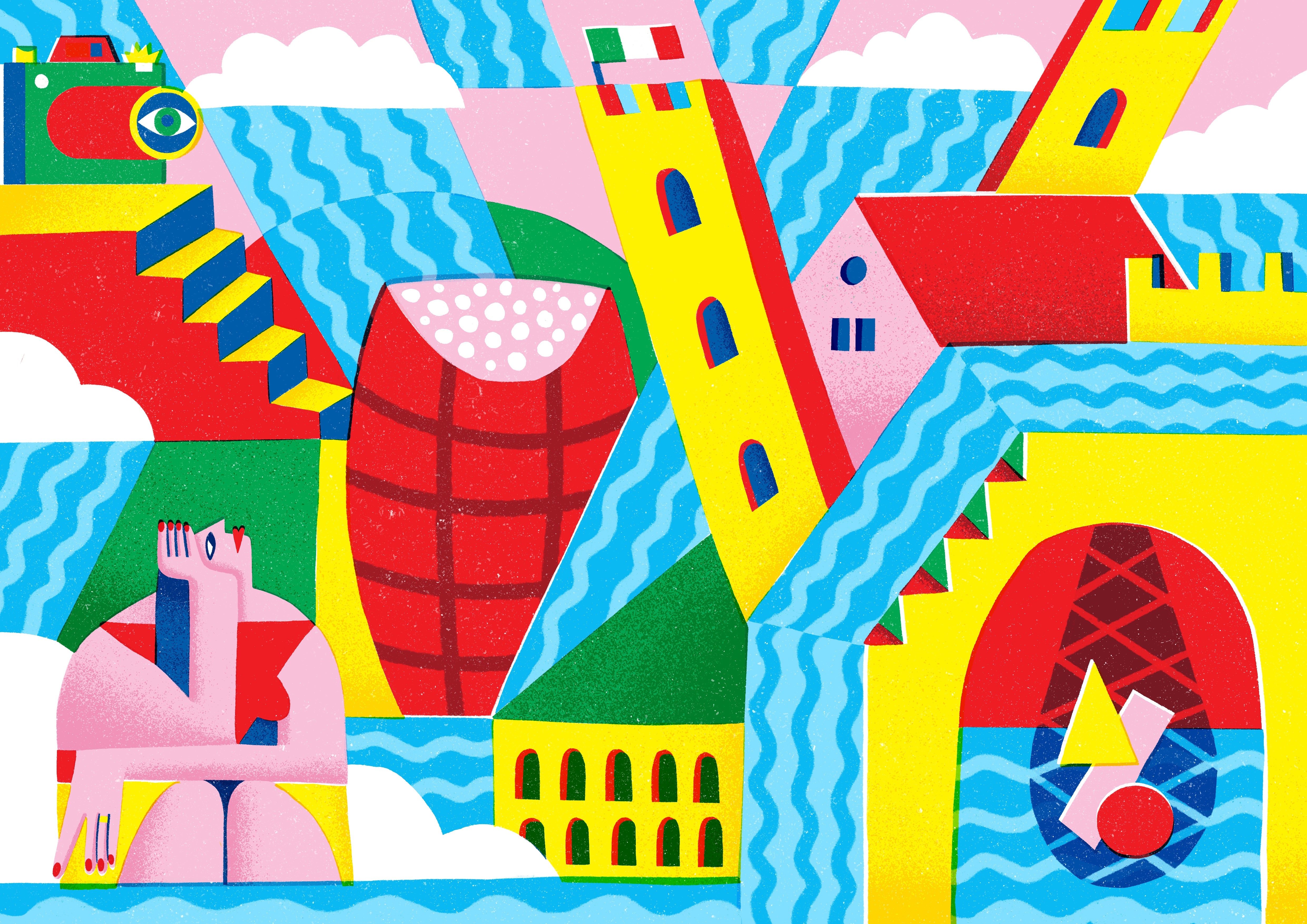 Designed amid the Emilia-Romagna floods, this playful illustration celebrates Bologna’s strength. Surrounded by its famous towers and delicacies, the city glows with vibrant colors—a lively emblem of hope and new beginnings.