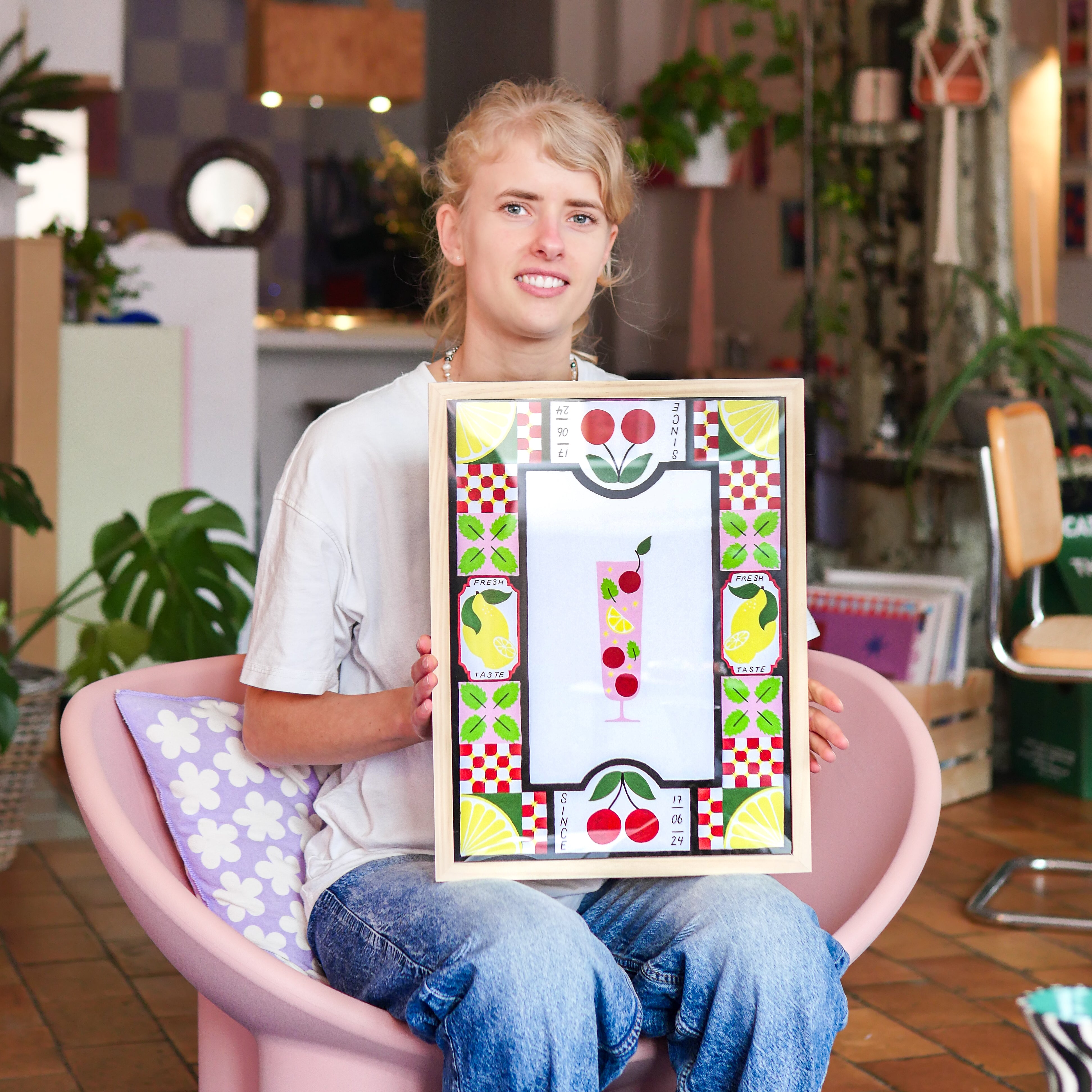 This playful print captures the magic of a glowing summer sunset with a tall glass of fizzy cherry lemonade sparkling in the light. Inspired by vintage jar labels, it mixes classic fruit-and-text styles with a modern pop of color. Bright cherry red shines alongside pink, green, and yellow hues, centered around a bubbly drink filled with cherries, lemon slices, and fresh mint. Perfect for adding a cheerful splash to kitchens, dining rooms, or any space craving a fun, refreshing vibe—some even love it in the bathroom!