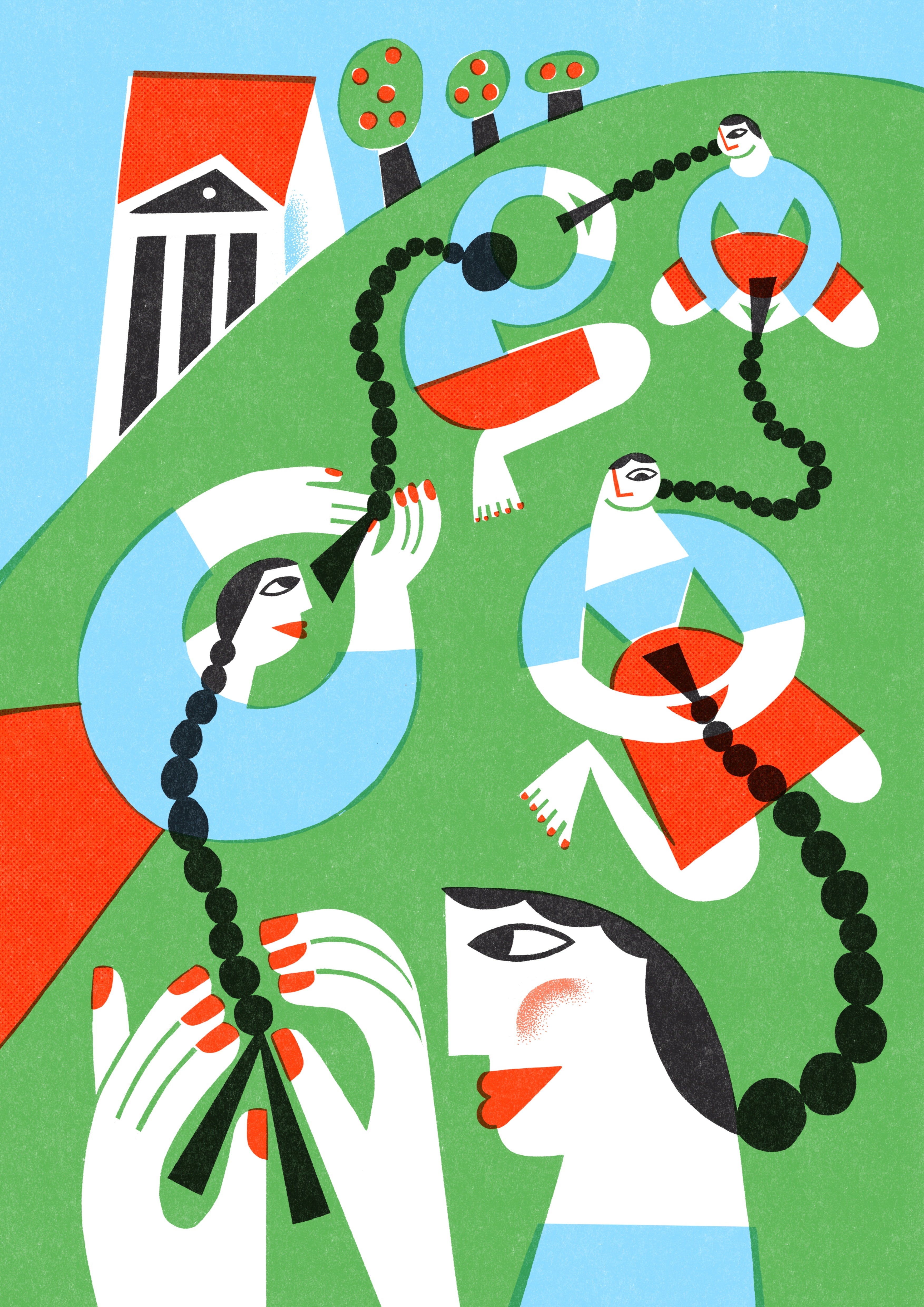 This joyful illustration captures the sacred bond between women, showing a circle of friends braiding each other’s hair—an age-old ritual that beautifully represents sisterhood and caring support.