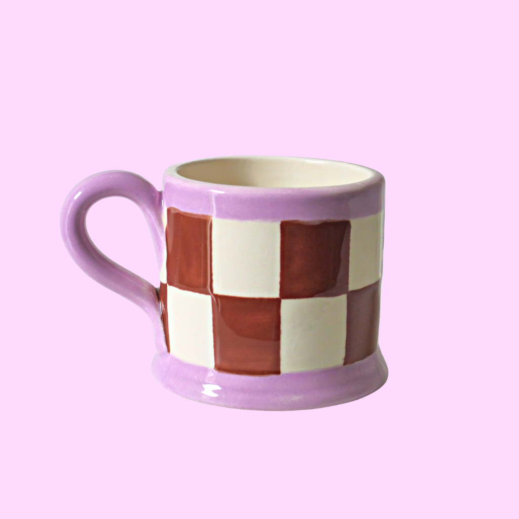 Elevate your coffee game with the Minerva Brown Gingham Mug! This hand-painted gem features a brown and cream checkerboard pattern that will add a dash of sophistication to your caffeine rituals. It's the perfect accessory for jazzing up your kitchen or giving your barista something to talk about. Created by Mürside of Mim Candles/Ceramics, each mug is a one-of-a-kind treasure that's also a breeze to clean, thanks to its dishwasher-friendly nature.