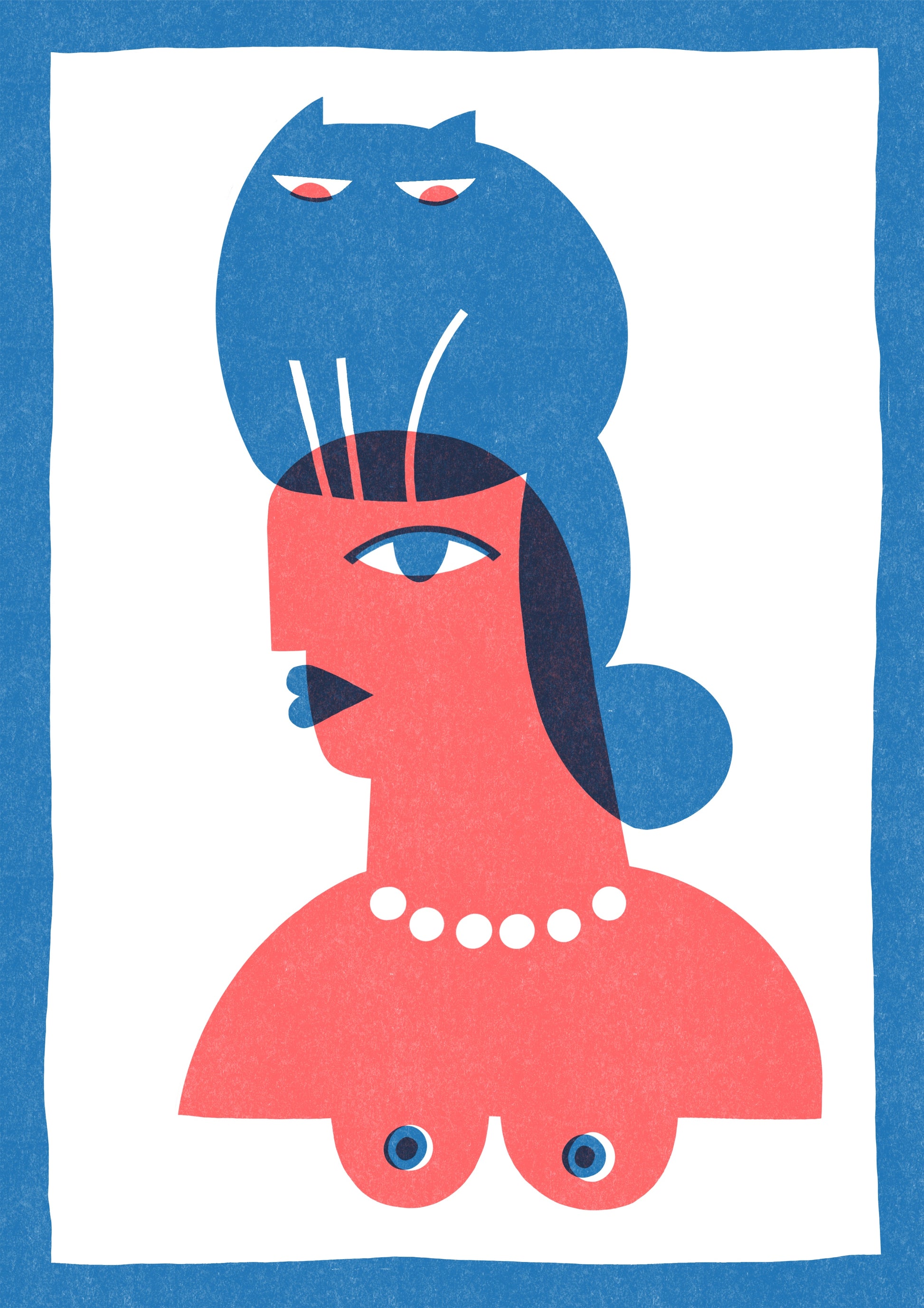 A bare woman wearing a pearl necklace, with her cat perched atop her head, playfully captures a carefree and independent feminine spirit. This image blends elegance, wit, and calm all in one.